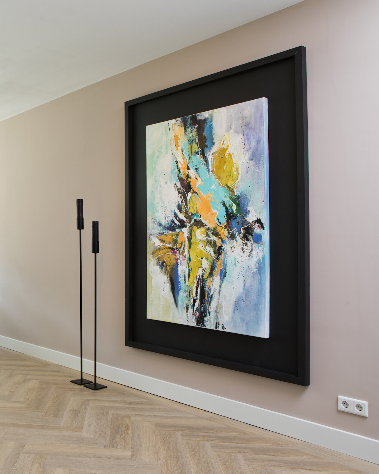 Voor de vloer en de wanden kozen ze voor lichte, warme tinten. De pvc-vloer met houtlook en visgraatmotief is de rustige basis waarop de meubels, veelal in meer donkere tinten, goed tot hun recht komen. “Die meubels hebben daarmee een wat stoerdere uitstraling.” Ze omschrijft de interieurstijl als een ‘combinatie van landelijk, industrieel en chic’. Een echte eyecatcher in de kamer is een groot, kleurig schilderij dat is gemaakt door de moeder van Rosie, kunstenaar Ans van Santvoort (www.ansvansantvoort.nl). Door de brede zwarte omlijsting springen de kleuren er nog beter uit. En de zwarte lijst biedt verbinding met andere zwarte elementen in de ruimte, zoals de stalen toegangsdeur (met getint glas) en de fronten van de keuken, die in een zwarte houtnerf zijn uitgevoerd. Opvallend in de keuken is verder het betonnen werkblad dat aan beide kanten doorloopt tot de vloer.