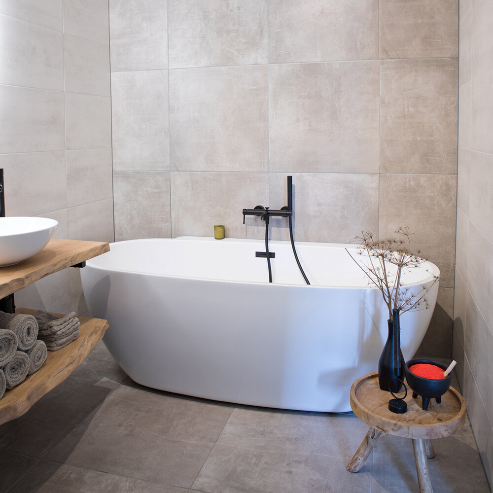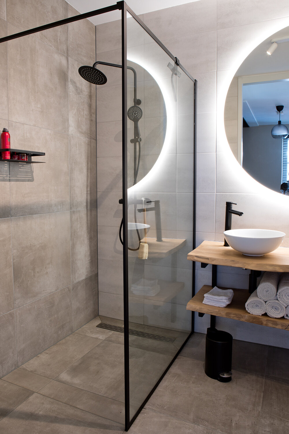 De badkamer heeft een natuurlijke uitstraling dankzij de bruin-beige tinten van de tegels, uitgezocht in Whoon Warenhuys in Waardenburg. “Ook het vrijstaande, ruime ligbad hebben we daar gekocht. De inloopdouche is gewoon lekker basic en de indirecte verlichting achter de grote spiegel geeft een mooi effect. We hebben gekozen voor een separaat toilet op deze verdieping en daardoor is één van de slaapkamers aan de voorkant dan iets kleiner geworden.”